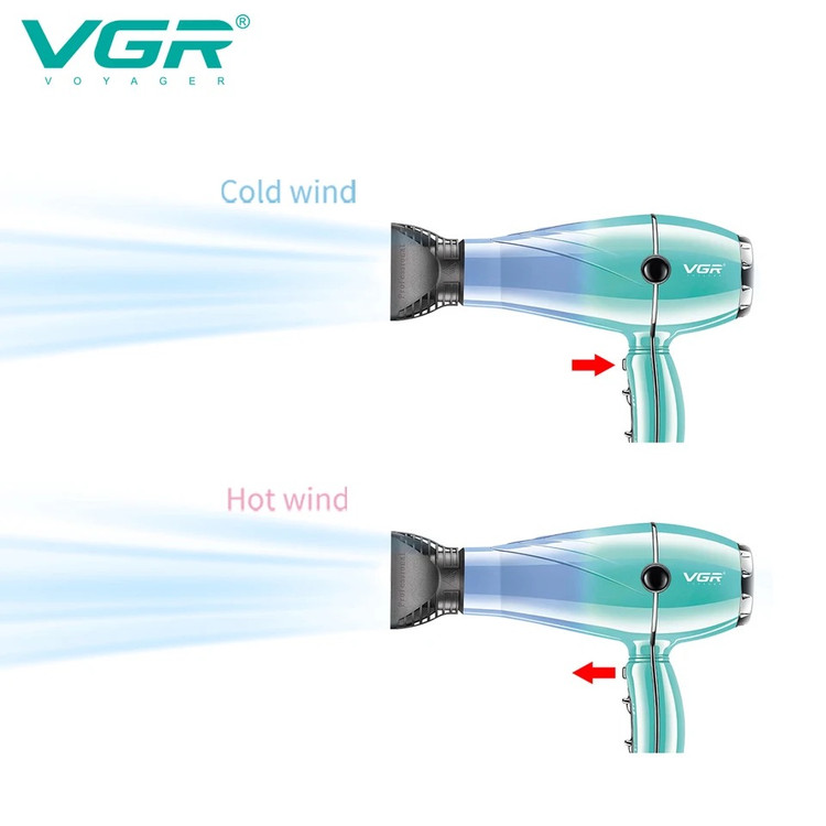 - سشوار حرفه ای موتور سنگین سالنی VGR مدل V-452 دارای قدرت موتور 2400 وات می باشد که دارای سه حالت تنظیم دما (سرد و متوسط و داغ) و دو حالت تنظیم سرعت (آهسته و تند) است همچنین دارای دکمه ی خنک کننده می باشد.