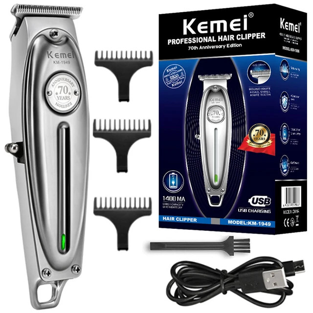 دیدن محصولات مرتبط- ماشین اصلاح سر خط زن کیمی KEMEI KM-1949 hair trimmer ماشین اصلاح با تیغه استیل ضد زنگ است که قابلیت اصلاح صفر زن و خط زن را دارد که مناسب برای افراد حرفه ای و استفاده شخصی در منزل برای مرتب کردن و خط انداختن مو و خط ریش است.بدنه ماشین اصلاح مدل KM-1949 از استیل است که کارایی و دوام بالایی دارد و همچنین از طراحی ارگونومیک بهره برده است. منبع تغذیه این ماشین اصلاح باطری لیتیوم یونی 1400 میلی آمپر است که با 2/5 ساعت شارژ 180 دقیقه اجرا ارائه می دهد و قابلیت شارژ به وسیله ی USB را دارد که به راحتی می توانید با پاوربانک، کامپیوتر، شارژر خودرو ... آن را شارژ کنید و هرجا که نیاز دارید از ماشین اصلاح خود استفاده نمایید.ماشین اصلاح KM-1949 ( کیمی 1949) دارای سه شانه اتصال به تیغه 1-2-3 میلی متر استو همچنین مجهز به چراغ نشانگر می باشد.